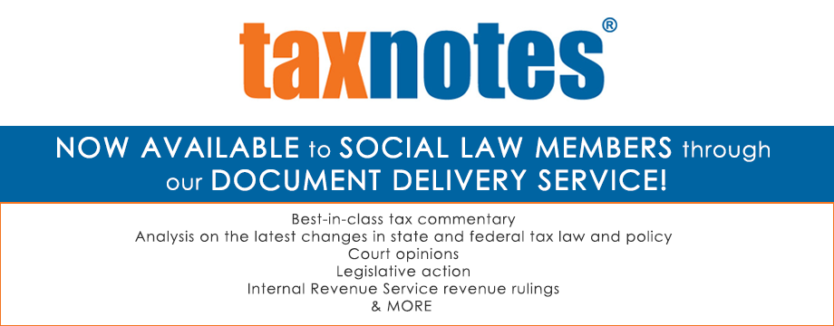Social Law’s Document Delivery service can provide its members with Tax Notes’ best-in-class tax commentary and analysis on the latest changes in state and federal tax law and policy, as well as on court opinions, legislative action, and Internal Revenue Service revenue rulings for attorneys and tax professionals whose success depends on being trusted for their expertise. Tax Notes also maintains a comprehensive online archive of rulings and other guidance documents. For more information email [email protected].