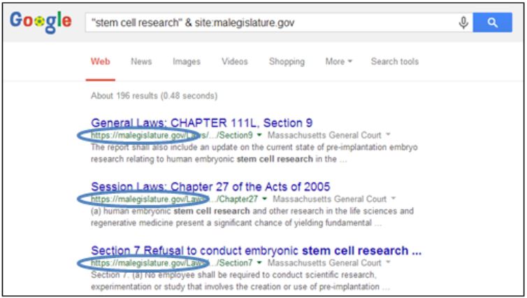 Want to narrow your search exclusively to the Massachusetts Legislature? No problem. You can use the “site:” extension to find results from only the Massachusetts Legislature’s web page that contain the term “stem cell research.”