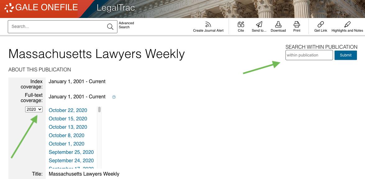 Once you’ve selected the publication, you will be able to see the availability of articles. For Massachusetts Lawyers Weekly, LegalTrac contains articles from 2001 through the current year. The past month’s worth of articles is embargoed, so you will not be able to see the most recent articles this way. However, you can run keyword searches, or browse by the date of the article for those that are in the database. The publication date reflects the day an article became available on MassLawyersWeekly.com, not the print version that is published weekly on Mondays.